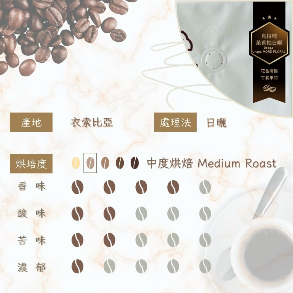 座落在衣索比亞國東南方號稱是該國最美麗風景的產區-烏拉嘠(URAGA),在堅持只採鮮紅的熟果和洗滌生豆水質控制在PH 7左右高規格後製處理廠的要求下,更易產出濃郁花香及水果甜味的超優質生豆,很值得期待其酸甜平衡的美妙風味。